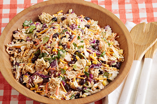 Super simple and delicious! Coleslaw blend, corn, black beans, cilantro, shredded cheese, lime juice, ranch dressing and ramen combine to make Ramen Taco Salad.