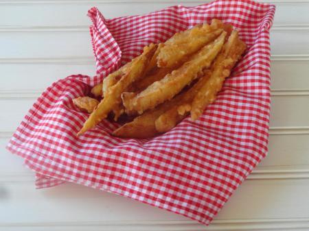Dip potato slices into the batter one at a time, and place in the hot oil so they are not touching at first. The fries must be placed into the skillet one at a time, or they will clump together. Fry until golden brown and crispy. Remove and drain on paper towels.