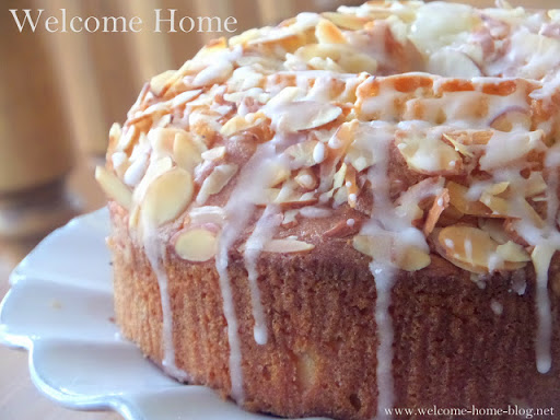 Place rack on waxed paper. Combine 1/4 c. milk, 3/4 c. sugar, 1/2 tsp. almond extract and toasted sliced almonds; pour over warm cake. Sprinkle with more almonds as desired.