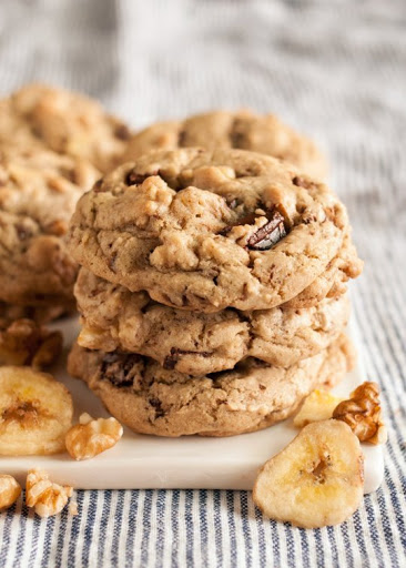 Whisk together the salt, baking soda, and flour in a small bowl. Add this to the wet ingredients in the mixing bowl, and stir gently until you've formed a thick dough and you see no more dry flour. Add the chocolate chunks, banana chips, and chopped walnuts, and use a folding motion to incorporate them into the dough. It's OK if some of the chunky pieces fall out.