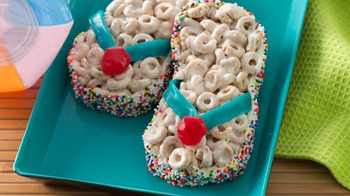 Lightly frost each flip-flop around cut sides; immediately press candy sprinkles on frosting. Place 1 Fruit Gushers fruit flavored snack at tip of each V shape, attaching with small amount of frosting.