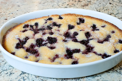 Now rinse and pat dry the blackberries. Pour the batter into the buttered baking dish. Sprinkle blackberries over the top of the batter; distributing evenly. Sprinkle ¼ cup sugar over the top.