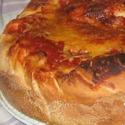 Place the 12 inch dough round into an ungreased 9 inch springform pan. Sprinkle dough with 1 cup of cheese. Shape sausage into a 9 inch patty and place in pan on top of the cheese. Layer pepperoni, mushrooms, green pepper, red pepper, and remaining cheese on top of sausage patty. Top with the 9 inch dough round and pinch edges to seal. Cut several 1/2 inch vent holes in the top crust. Spread sauce evenly on the top crust, leaving a 1/2 inch border at the edges.
