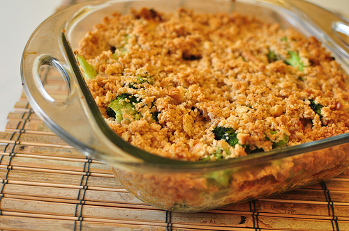 Add 4 Tlbs butter to one half and spread over broccoli in pan.