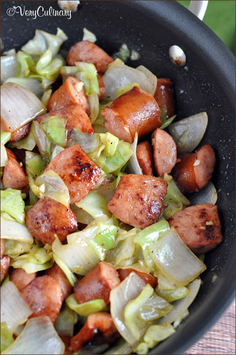 2.In the same pan with some of the rendered kielbasa fat, add the cabbage, onion, garlic, sugar, salt, and pepper. Stir to combine and cook for about 10 minutes, stirring occasionally.