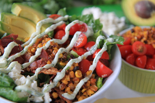 Top with crumbled cooked bacon, chopped tomatoes, roasted corn, sliced avocado, and crumbled feta cheese.