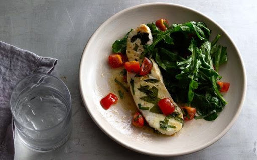 HALIBUT w/TOMATO SAFFRON VINAIGRETTE