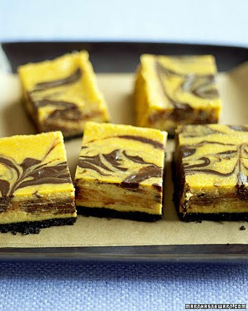 6. Pour remaining pumpkin mixture into prepared pan. Drop dollops of chocolate mixture onto pumpkin mixture; swirl. Bake until cheesecake is set but jiggles slightly when gently shaken, 40 to 50 minutes.