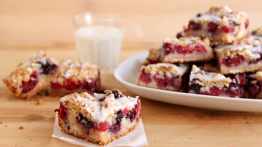 In separate bowl, toss blueberries, raspberries, blackberries, granulated sugar and cornstarch. Spread on top of sugar cookie mixture. Crumble remaining dough on top of fruit mixture.