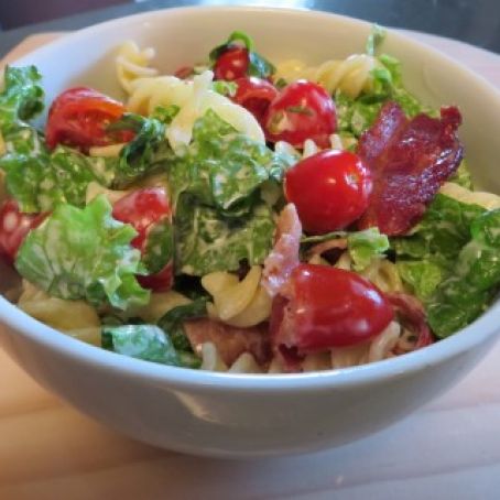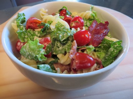 Place the cooled pasta in a large bowl. Add the tomatoes, bacon and mayonnaise mixture. Fold all together using a spatula.
