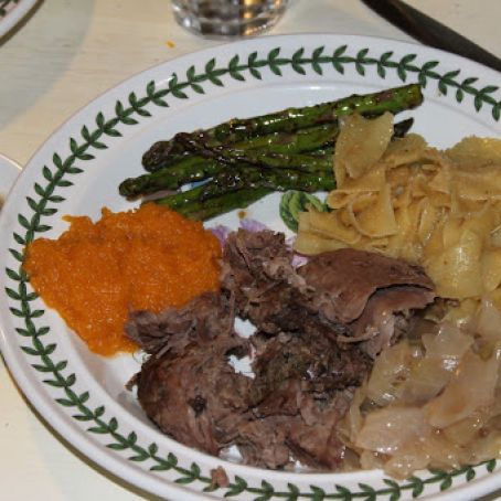 A full elegant meal of rich slow-cooked leg of lamb, bright cabbage, savory rosemary noodles, sweet squash, and crisp, tender asparagus.