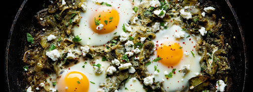3. Crack the eggs into the tomatillo mixture. Season the eggs with salt, then transfer the skillet to the oven and bake until the whites are set but the yolks are still runny, 8 to 10 minutes. Remove from the heat, top with the Cotija cheese and Aleppo pepper, and serve with warm pita bread for dipping.