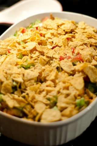 Coarsely crush your chips and place two cups on the bottom of a 2-qt. casserole dish. I just eyed this measurement :)
