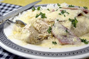 Arrange the chicken breasts on top of the ham. Top each chicken breast with a half slice of thick cut bacon. Combine the soup, sour cream, milk or light cream and pepper in a bowl. Pour evenly over chicken breasts.