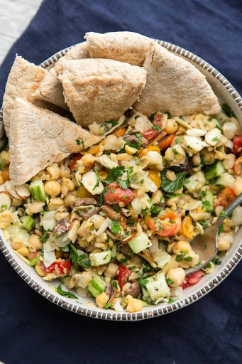 Place chickpeas in a bowl and mash slightly with a fork. Add in the tomatoes through the almonds, tossing together. Drizzle the olive oil and lemon juice over the mixture and stir until combined. Taste and add salt/pepper to your liking. Serve with cooked grains, pita, or as a delicious topping for hummus.