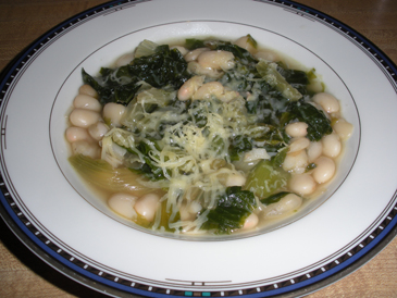 5. Stir in the beans. Add the stock, escarole, and salt and pepper. Lower the heat and cook for about 5 minutes or until hot, adding additional stock if you prefer a thinner soup.