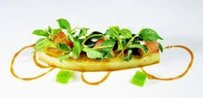3. Heat the melon in the salamandra and drizzle the grapefruit reduction over the top.