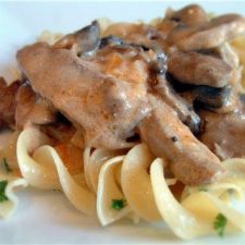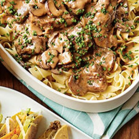 Delicious savory beef chuck cooked in a Dutch oven until tender, with sweet, deep flavors of cognac, onions, mushrooms, and a creamy sauce. Served with egg noodles.
