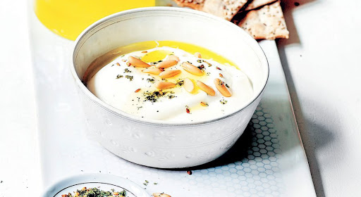 In a large bowl, beat the yogurt until light and smooth. Scrape it into a shallow, wide serving bowl, and smooth with the back of a spoon to create a wide indentation. In a small bowl or liquid measuring cup, whisk the oil and lemon juice until emulsified; season well with salt and pepper. Pour the vinaigrette over the yogurt so it floods the indentation. (You can just drizzle the olive oil and squeeze the lemon juice directly onto the yogurt) Sprinkle with the nuts and za?atar or parsley. Taste, adding a bit more salt if desired. Serve with warm bread.