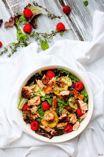 Once the the zucchini and salmon and cooked, go ahead and build your bowl. Greens first, then veggies, and salmon. Drizzle in your balsamic glaze, thyme sprigs leaves, and the rest of your oil. Toss all together and place in bowl.