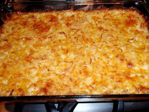 Some people use cream of mushroom soup instead of chicken. I prefer chicken. You could add cubed ham, I just ask the deli to give me a half inch thick slice; or you could cook bacon and crumble into the recipe or you could precook sausage, drain and add. Additionally, you could add about 4 eggs, mixed in a separate bowl and added to mixture before the potatoes and you got an awesome breakfast meal.