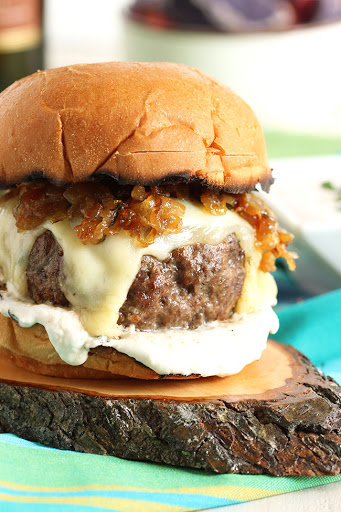 French Dip Burger with Havarti, Swiss and Bourbon Fried Onions