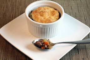 Place 1 cup pork mixture into each of 6 (8-ounce) ramekins. Take puffed pastry and cut 6 (5-inch) dough circles. Place 1 dough circle on each ramekin, tucking edges inside. Cut an X in the top of each circle; coat lightly with cooking spray. Place ramekins on a baking sheet. Bake at 400° for 40 minutes or until golden and bubbly.