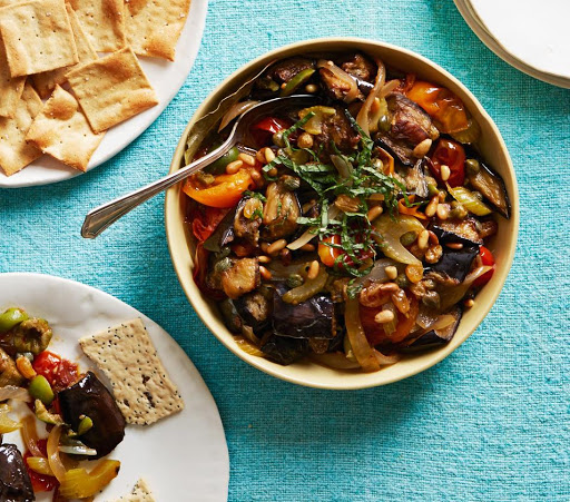 A different take on the classic caponata, this one adds anchovies and capers to the mix and uses barely cooked tomatoes instead of tomato sauce.