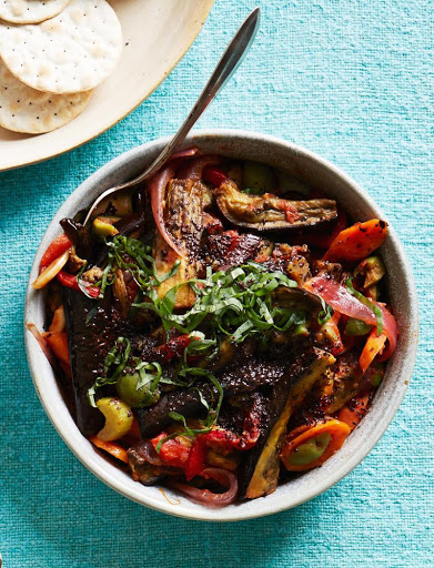 Heat oven to 425 degrees. Toss eggplant with 4 tablespoons oil, then spread out on a baking sheet lined with parchment paper. Roast eggplant, turning once, until crisp and golden, 30 minutes. Remove from oven and set aside.