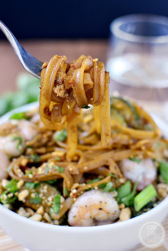 Drain then add rice noodles to the wok and toss to combine. Add sauce then turn heat up to bring to a boil and stir fry for 3-4 minutes or until rice noodles are tender. Add shrimp back into the wok then toss to combine. Divide noodles between bowls then top with reserved green onions, chopped peanuts, and chopped cilantro.