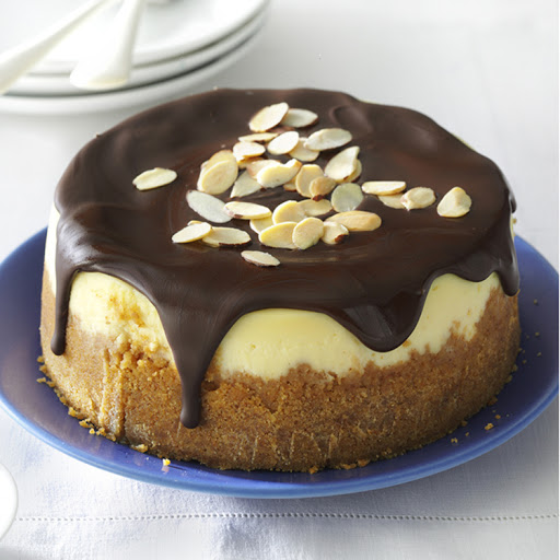 For topping, in a microwave, melt chocolate and shortening; stir until smooth. Cool slightly. Remove rim from springform pan. Pour chocolate mixture over cheesecake; sprinkle with almonds.