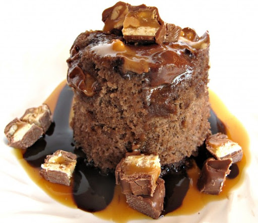 Add a few pieces of chopped candy bar and a generous dousing of chocolate or caramel syrup on top of the 3-2-1 cake. Then eat it right out of the mug. If you want to transfer the cake onto a plate, run a knife around the edge between the cake and the mug to loosen, dump out onto a plate, then add the chopped candy and syrup.