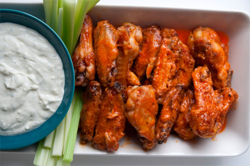 While the chicken is roasting, melt the butter in a small bowl with the garlic. Pour this along with the hot sauce into a bowl large enough to hold all of the chicken and stir to combine. Remove the wings from the oven, transfer to the bowl and toss with the sauce. Serve warm with crumbled blue cheese on top.