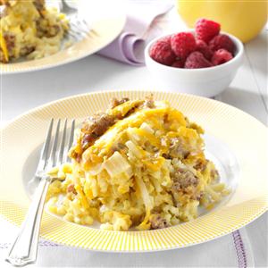 In a greased 5- or 6-qt. slow cooker, layer half of the potatoes, sausage, onion, chilies and cheese. Repeat layers. In a large bowl, whisk the eggs, milk, salt and pepper; pour over top. Cover and cook on low for 7-9 hours or until eggs are set.