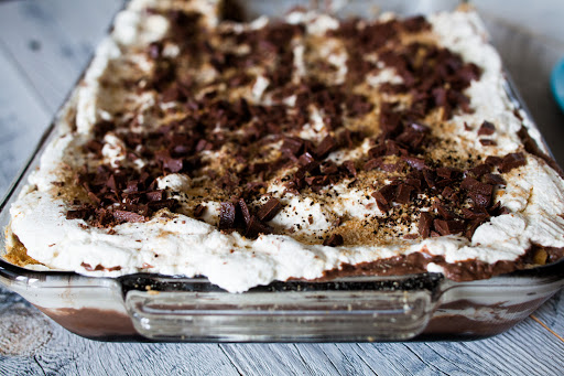 In a 9x13 inch baking dish, line the bottom with graham crackers - it doesn't have to be perfect. If you need to break some of the crackers to fit them in, go for it. Spread ⅓ of your pudding over the graham crackers, then ⅓ of the whipped cream. Sprinkle ⅓ of your chopped chocolate over the whipped cream, then sprinkle ⅓ of your ground coffee on top of that.