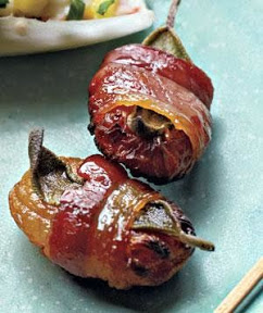 Heat oven to 375º F. Place a sage leaf on each apricot, wrap with a piece of bacon, and place seam-side down on a baking sheet.