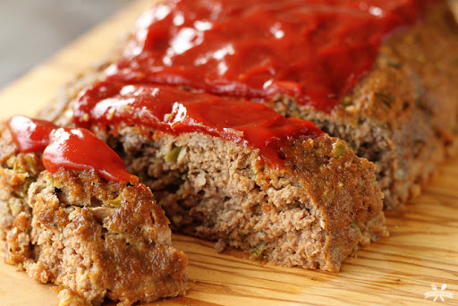 In a large bowl, combine the meat, moistened bread crumbs, egg, onion, bell pepper, garlic powder, pepper and salt. Mix until the ingredients are well incorporated. Pour the mixture into the baking dish and form into a loaf in the center of the dish.