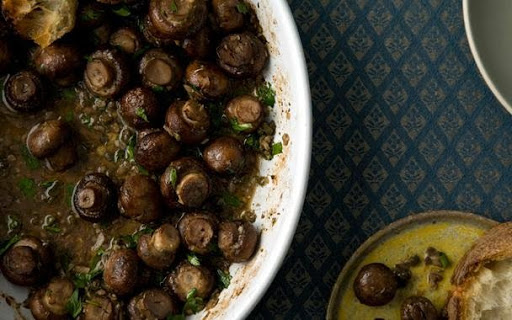 Toss mushrooms with capers, garlic, oil, and 1/8 tsp each of salt and pepper in a 1 1/2- to 2-qt shallow baking dish. Top with butter and roast, stirring occasionally, until mushrooms are tender and golden, 15 to 20 minutes.