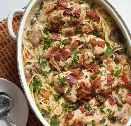 Remove chicken from the oven, stir pasta into the sauce and serve topped with crumbled bacon and more fresh parsley.