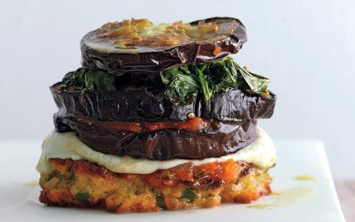 Arrange egg patties about 3 inches apart on a baking sheet. Top each with 2 Tbsp tomato sauce, 1 slice mozzarella, 1 eggplant slice, 2 more Tbsp tomato sauce, another eggplant slice, arugula mixture, and remaining eggplant.