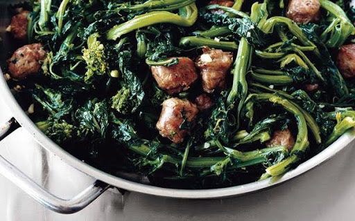 Separate broccoli rabe, then saute in garlic oil until coated with oil and heated through, about 4 minutes. Stir in sausage.