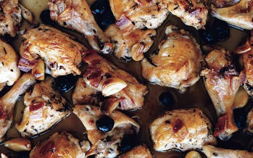- This dish works with rabbit, but it's equally appealing with chicken. Roasted with super-savory pancetta and olives, the garlicky meat stays moist in a shallow bath of white wine.