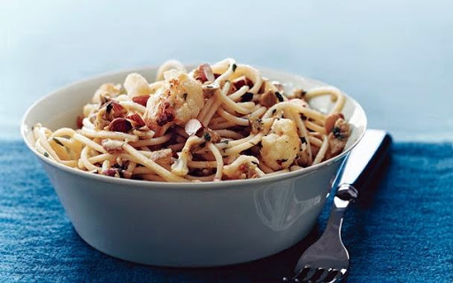 LINGUINE w/CAULIFLOWER, GREEN OLIVES & ALMONDS
