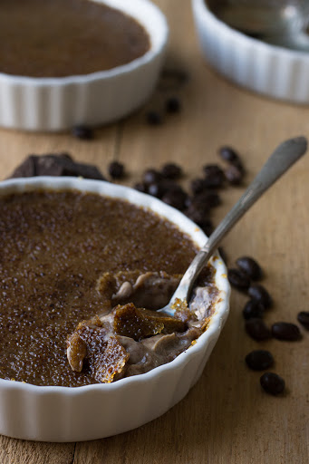 When ready to serve, uncover the ramekins, dab off any condensation with a paper towel, and sprinkle the top of each custard with a thin layer of turbinado sugar (granulated sugar will also work), about 1-1½ teaspoons each. Shake the ramekin to distribute the sugar evenly across the surface, discarding any excess. With a kitchen torch, caramelize the sugar. Return the ramekins to the refrigerator for 30 minutes, uncovered, then serve immediately.