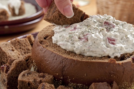 Slice top off 1 bread and hollow out bread shell. Pour dip mixture into hollowed-out shell. Cut second bread and top of first one into 1-inch chunks and use for dipping.