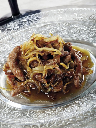 Put the veal on a serving dish, cover with the onions and top with the sauce. Serve with fresh pasta.