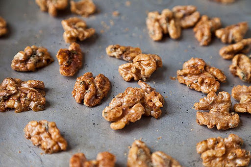 In a large bowl, beat the egg white. Add the walnuts, and toss. Add the maple syrup and the butter, and incorporate. Add the sugars, and toss until the walnuts are evenly coated.