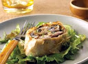 4. Lay phyllo dough on a clean dish towel and spread mushroom mixture about 1 inch away from short edge of dough. Fold sides over about 1/2 inch and use towel to help you roll it up like a jellyroll. Place roll on prepared baking sheet and coat lightly with cooking spray.