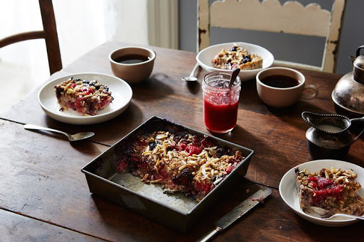 A new spin on oats, this baked dish comes together with only a few stirs and less than an hour of time but feels like a special and indulgent breakfast. Vary the fruit with the seasons, and make a batch on Sunday so that you can cut slices and enjoy it through the week. It's lovely either hot or cold. If you're gluten-free, be sure to use certified GF oats.