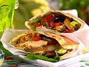 Spray a grill basket with olive oil. Grill the chicken breasts over medium heat for 8 to 10 minutes, until no longer pink in the thickest portion of each breast. Spread the onion rings over the surface of the basket and grill while the chicken is cooking. Turn the basket frequently. The onion rings will blacken as they cook; this will also take 8 to 10 minutes. When the chicken and onion rings are cooked, place the pita breads on the grill for about 2 minutes per side, until grill marks show. Slice the chicken into very thin pieces.